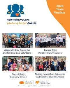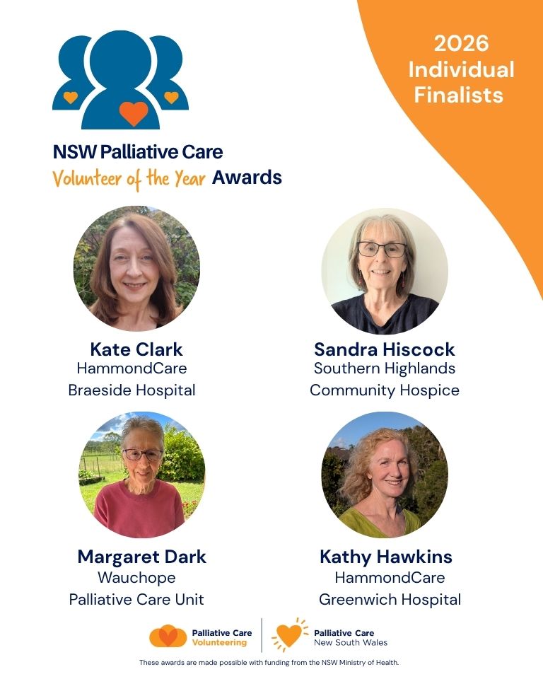 Palliative Care NSW is pleased to announce the finalists for the 2026 NSW Palliative Care Volunteer of the Year Awards. We have four finalists in each category. Read about each of our finalists by clicking on their names.