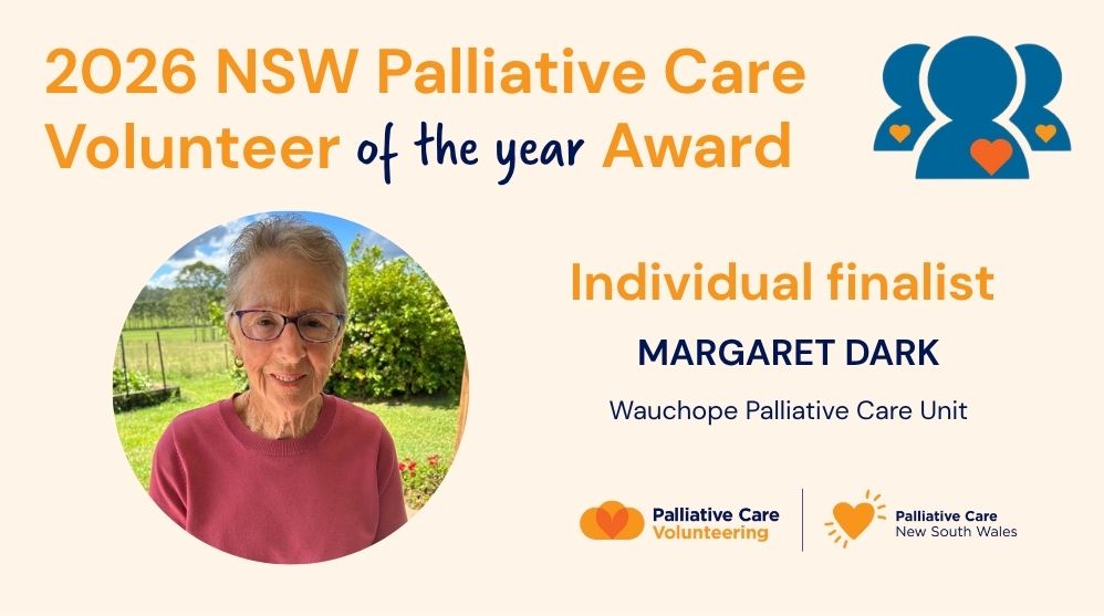 Congratulations Margaret on being named as finalist. You are truly deserving of recognition. Palliative Care NSW will announce the award winners on Wednesday 20th May during National Volunteer Week.